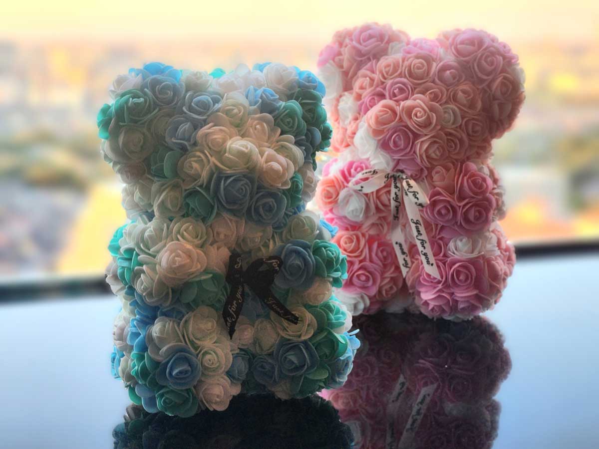 樹脂素材の造花で作られた愛らしいテディベア。お部屋に長く飾っていただけるアイテムです。透明のケースにお入れしてご用意いたします。
